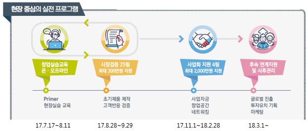 2) 시장검증[25팀 선발, 17.8.28~17.9.29 [1개월진행예정] - 고객 수요 검증을 위한 최소요건제품, 고객조사 비용(최대 3백만원) 지원 * 최소요건제품(MVP) : 상용화 목적이 아닌 고객반응 확인을 위한 최소한의 기능만 구현 한 초기 시제품 * 고객조사 : 고객에 대하여 창업아이템에 대한 인터뷰 조사 진행